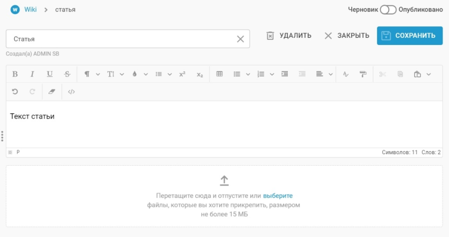 Если вы хотите прикрепить к странице файл, выберите или перетащите файл в поле загрузки файла снизу от текстового редактора.